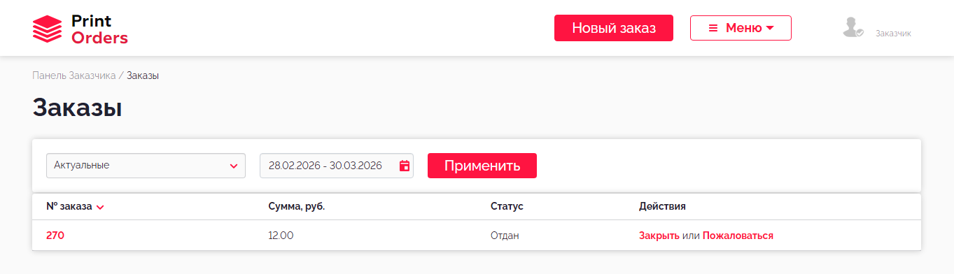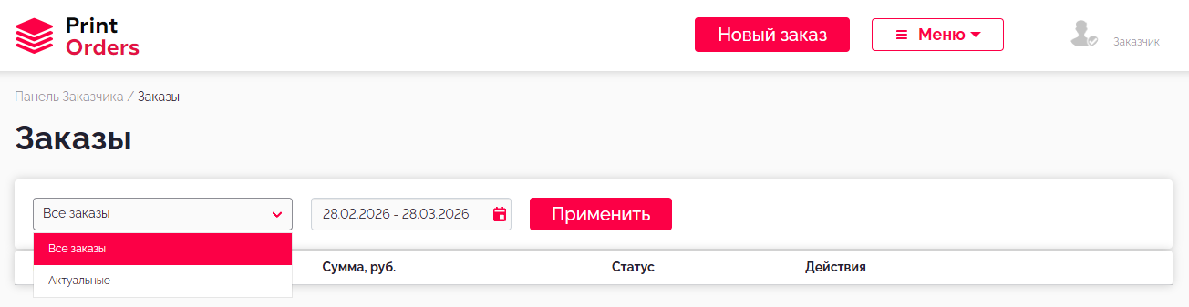В Актуальных отображаются заказы в работе, во Всех все Ваши заказы. Так же Вы можете выбрать период, интересующий Вас и посмотреть все заказы за этот период.
