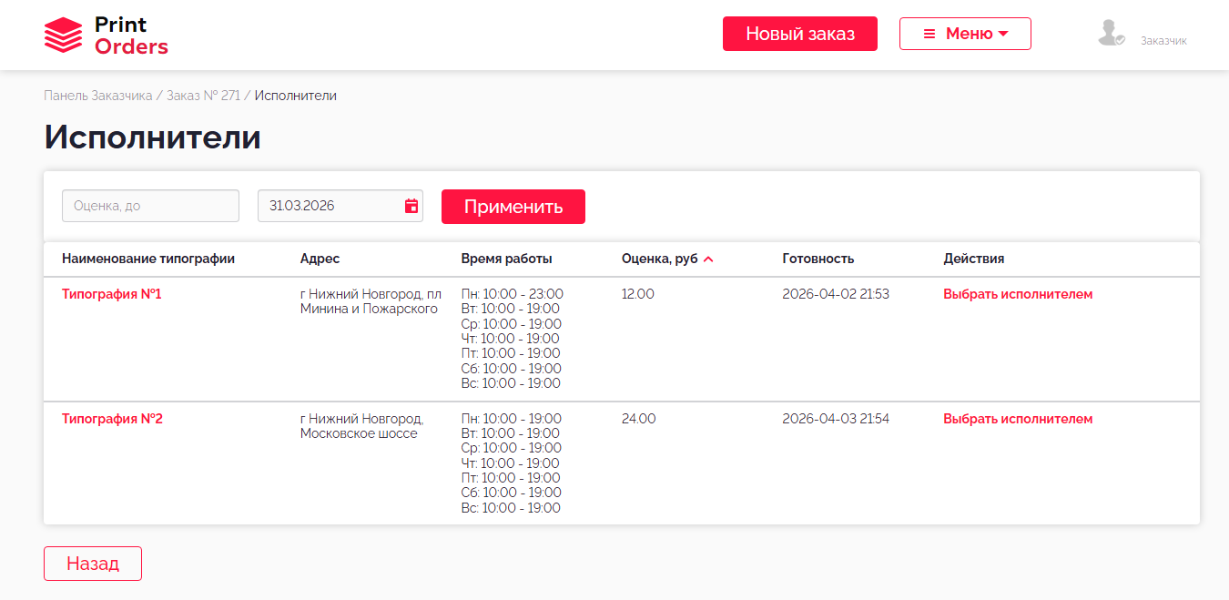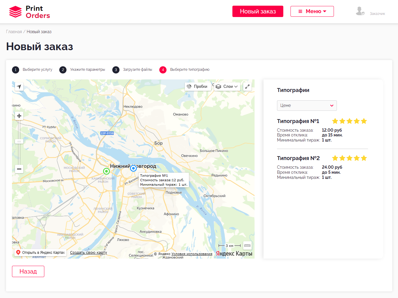 На карте Вы можете выбрать удобную для Вас типографию, посмотреть стоимость заказа, отправить заказ. Рядом с картой расположен блок "Типографии" в котором Вы также можете выбрать типографию, посмотреть стоимость заказа, время отклика типографии на новый заказ и её рейтинг, сортировать типографии по цене, рейтингу, отклику.
