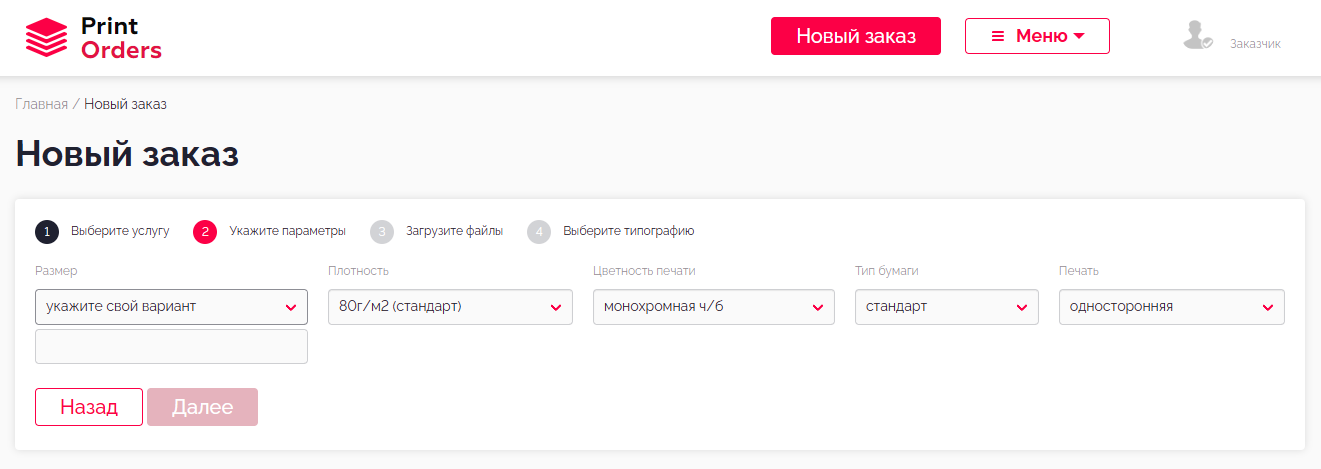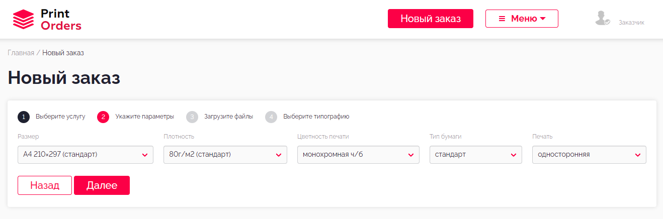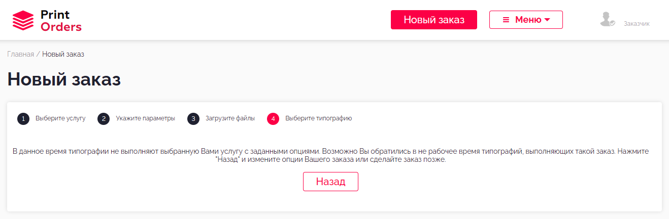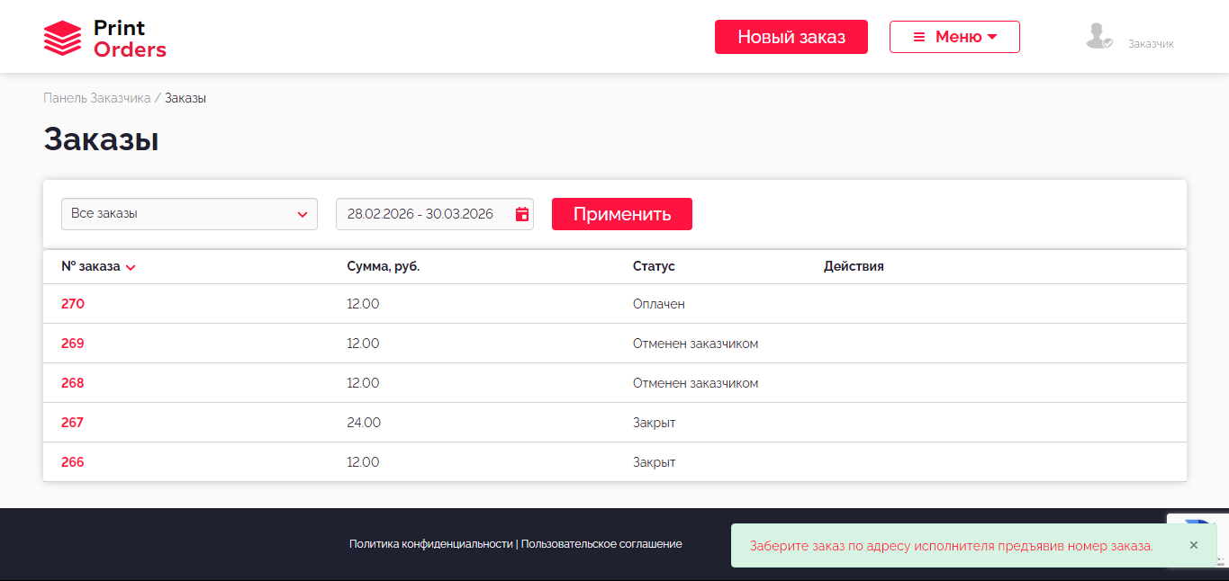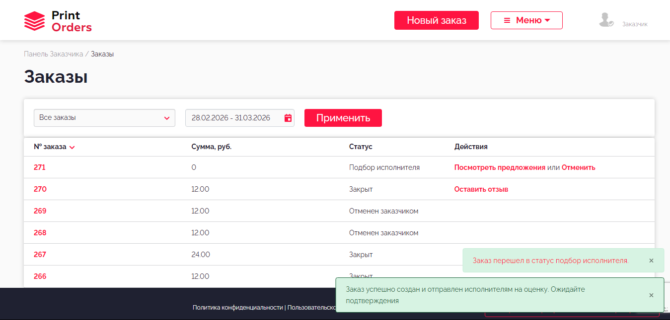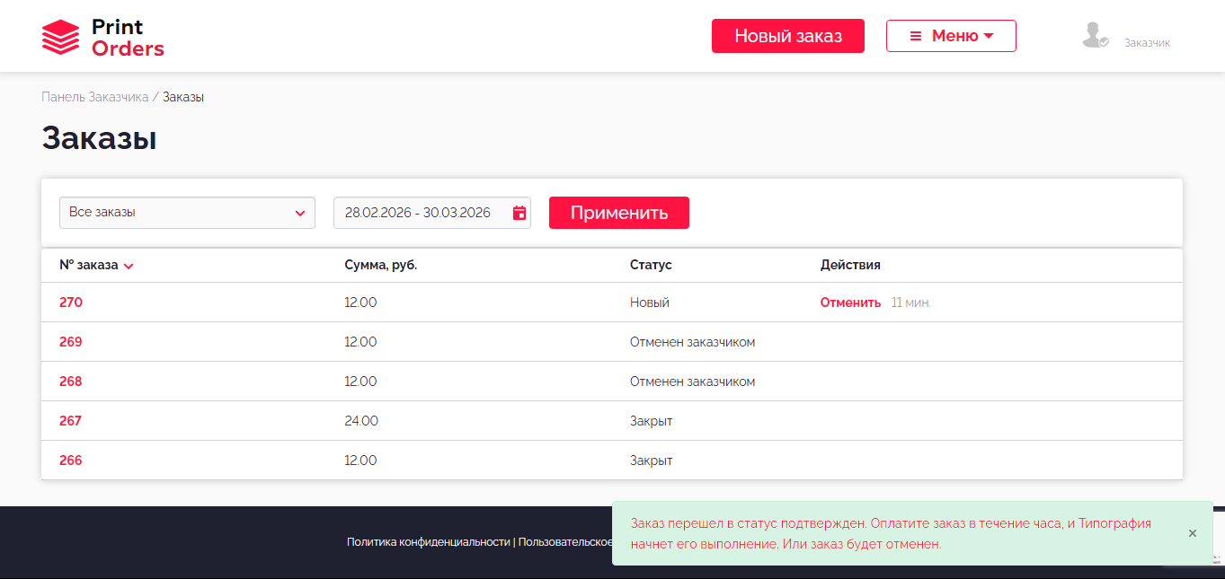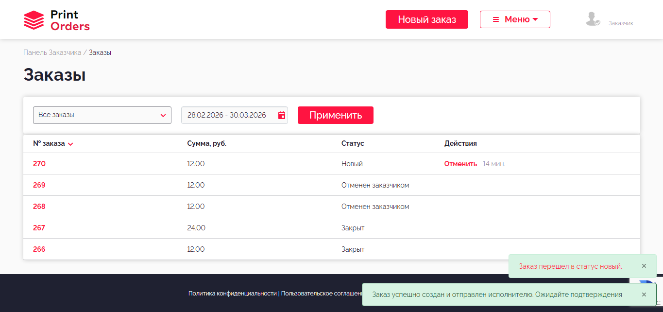 Нажмите Сделать заказ или Отправить заказ на карте - Заказ успешно создан и отправлен выбранной Вами типографии. Ожидайте подтверждения. Заказ перешел в статус новый. На странице заказов появится созданный Вами заказ, его номер, сумма, статус, оставшееся время на отклик типографией и возможность его отмены.