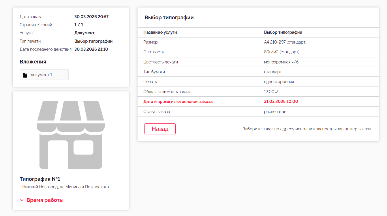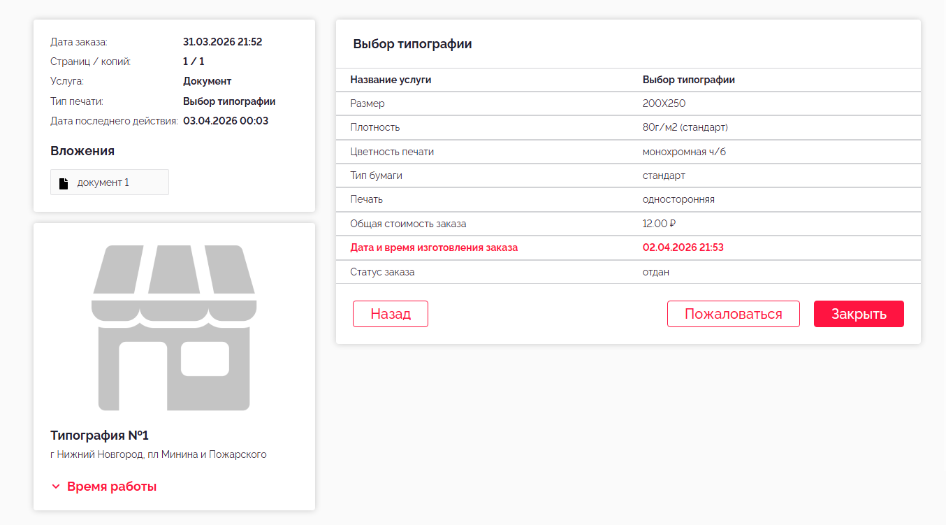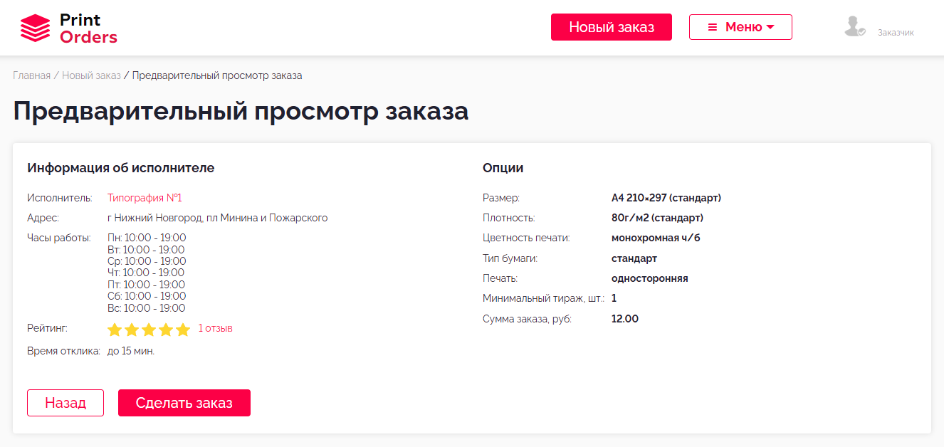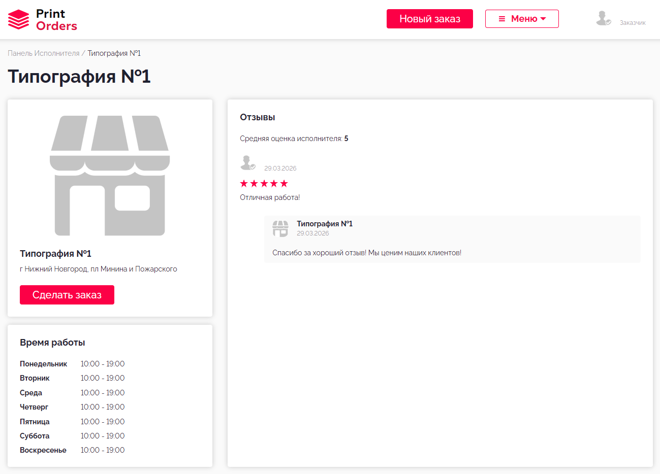 Здесь Вы можете посмотреть информацию о типографии, её адрес, часы работы, среднюю оценку, отзывы о её работе. Так же здесь Вы можете сделать заказ именно в этой типографии. Кнопка Сделать заказ активна только во время работы, которое указала типография.