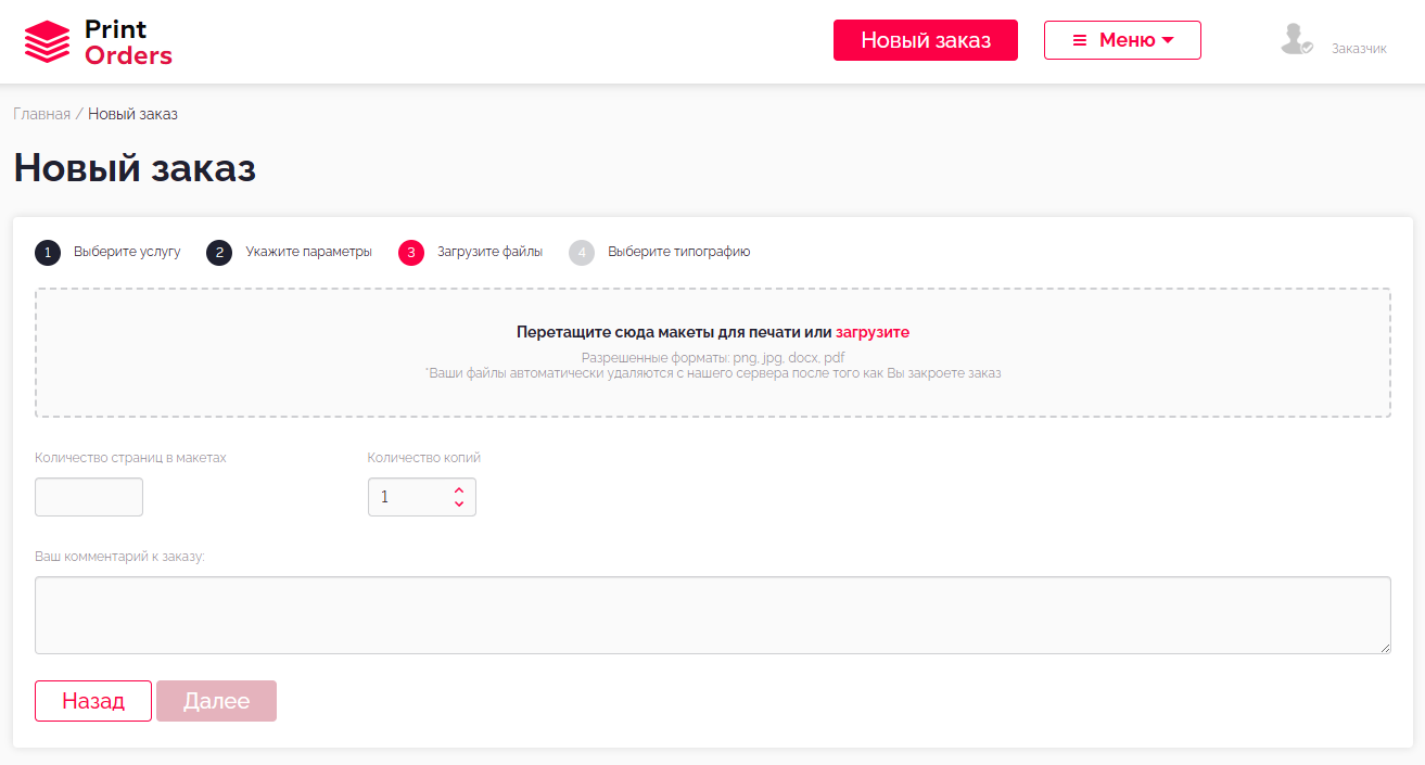 Загрузите файл(ы) указанных форматов. Ваши файлы защищены и автоматически удаляются с нашего сервера после того как Вы закроете заказ. Количество страниц в макетах сервис считает сам из Вашего(их) файла(ов), укажите количество копий. По необходимости напишите комментарий к заказу.
