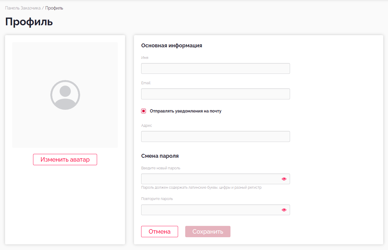 Здесь Вы можете изменить имя и аватар они отображаются в отзывах и спорах. Изменить пароль, включить или отключить отправку уведомлений о статусах заказов на электронную почту.