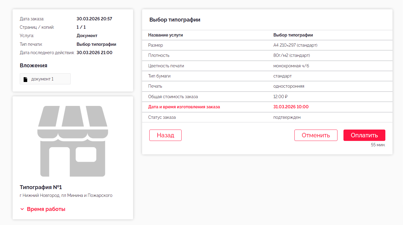 Далее типография подтвердит Ваш заказ указав дату и время изготовления заказа. Нажав на номер заказа или всплывающее сообщение в правом нижнем углу Вы можете посмотреть детали заказа, оплатить или отменить заказ. На оплату заказа даётся 1 час (60 минут). Заказ перешел в статус подтвержден. Оплатите заказ в течение часа, и типография начнёт его выполнение. Или заказ будет отменён.