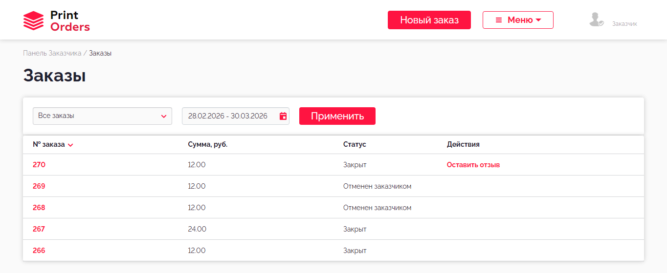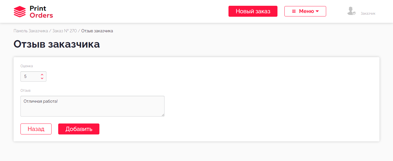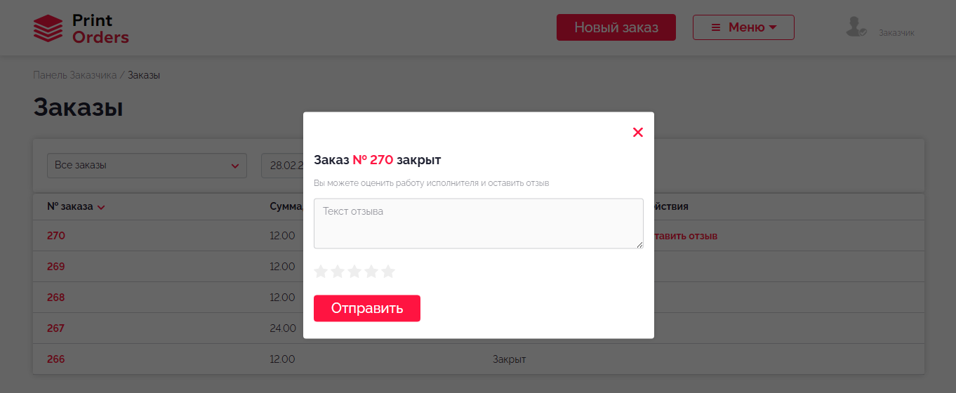 Вы можете оценить работу типографии и оставить отзыв сразу после закрытия заказа или позже во Всех заказах. Оценки и отзывы отображаются на странице типографии и влияют на её рейтинг. Типография может добавить свой комментарий, он отобразится под отзывом.