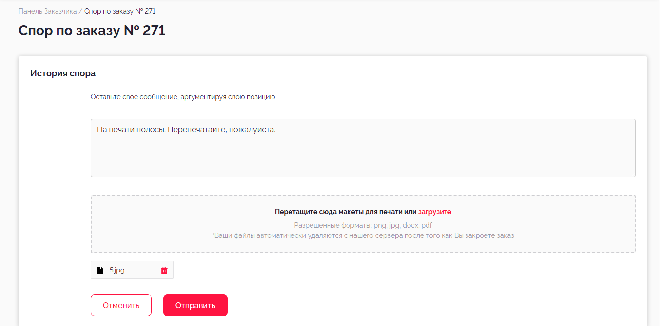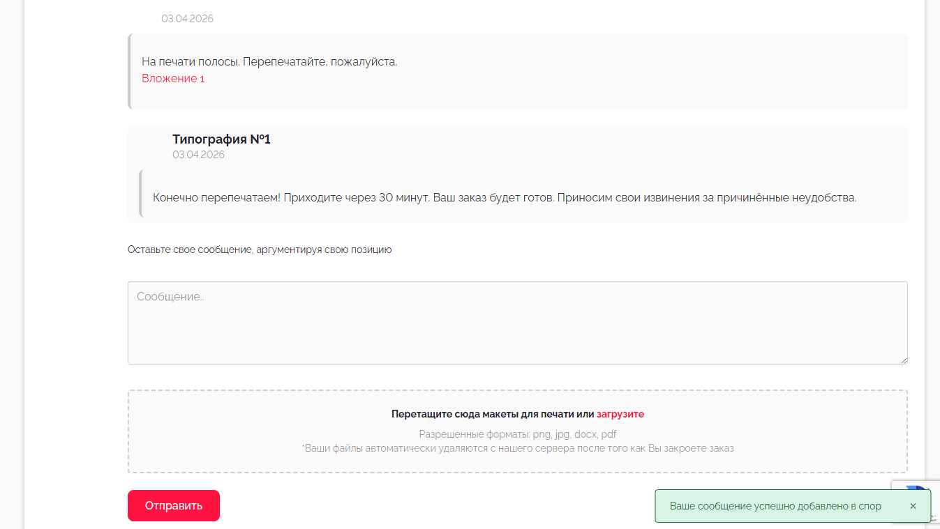 Если дата и время изготовления заказа подошли, а типография не подтвердила его готовность или заказ не надлежащего качества, то на странице заказов и так же в деталях заказа у Вас появится возможность написать типографии. Вы можете написать типографии в спор о заказе. У типографии будут сутки (24 часа) на решение спора. Если по истечении этого времени типография не решит проблему с Вашим заказом, Вам вернутся средства в полном объёме. Так же Вы можете закрыть спор если типография сделала заказ.