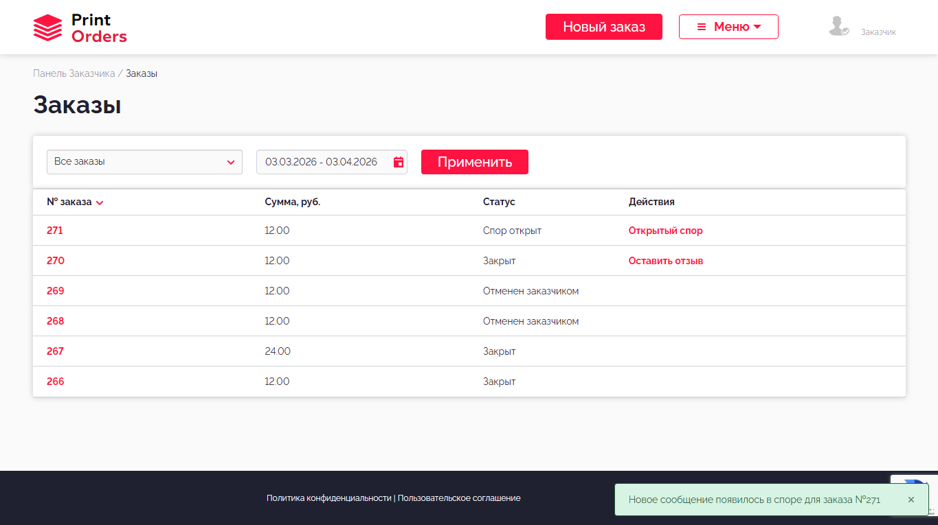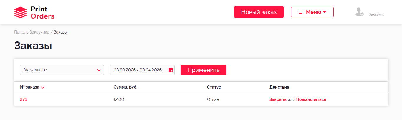На странице заказов и так же в деталях заказа у Вас появится возможность закрыть заказ или написать типографии если Вас, например, не устраивает качество заказа.