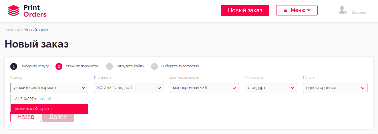 Если в предложенных вариантах нет интересующей Вас опции укажите свой вариант. В таком случае заказ уйдёт всем типографиям, оказывающим такую услугу и ожидайте оценок типографиями, по сумме, дате и времени изготовления заказа, далее выберете подходящую для Вас типографию.